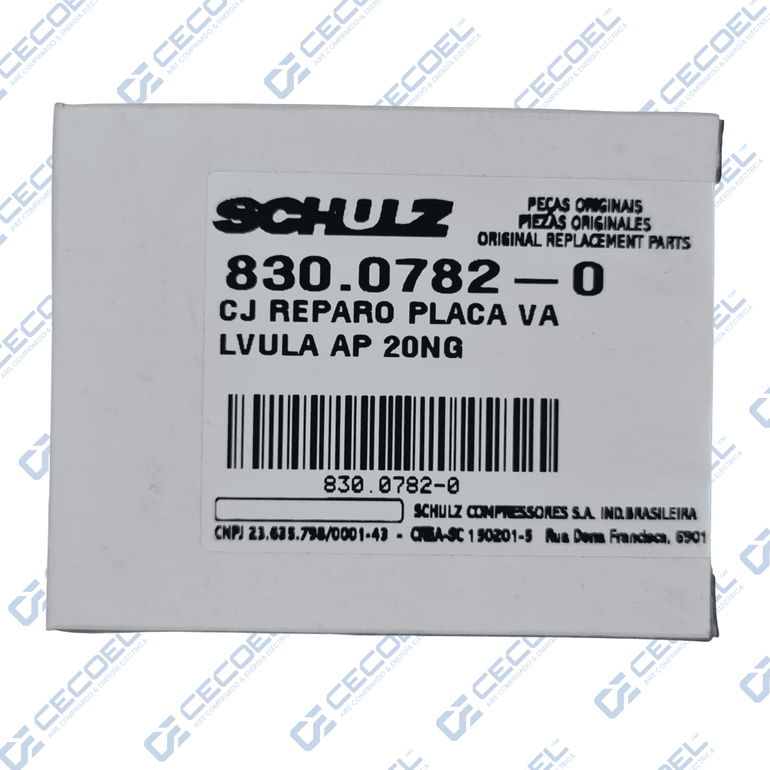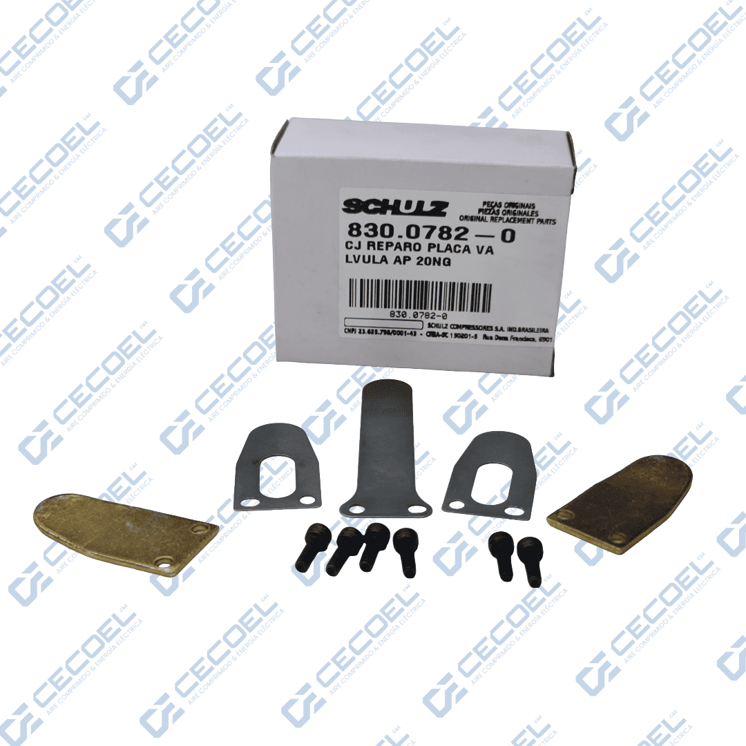 Kit de reparación original Schulz (Código 830.0782-0) para placa de válvulas de admisión y compresión en la etapa de alta presión. Fabricado con acero de máxima resistencia térmica, este kit restaura la capacidad de carga final de tu compresor de pistón de dos etapas. Altamente compatible con la línea MAX (MSV 20, MSV 30, MSV 40). Asegura un sellado hermético y alcanza la máxima presión sin sobrecalentar tu motor.