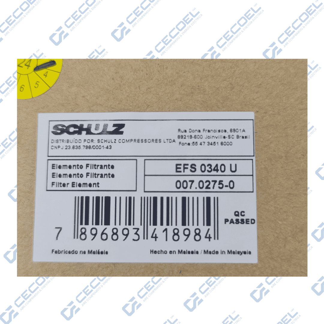 El elemento pre-filtro coalescente Schulz (Código: 007.0275-0 / Modelo EFS 0340 U) es la solución de alto caudal para el tratamiento primario del aire comprimido. Diseñado para retener partículas sólidas, agua y aerosoles de aceite pesados, este repuesto protege tus secadores y maquinaria, garantizando un flujo de aire limpio y eficiente en tu red industrial.