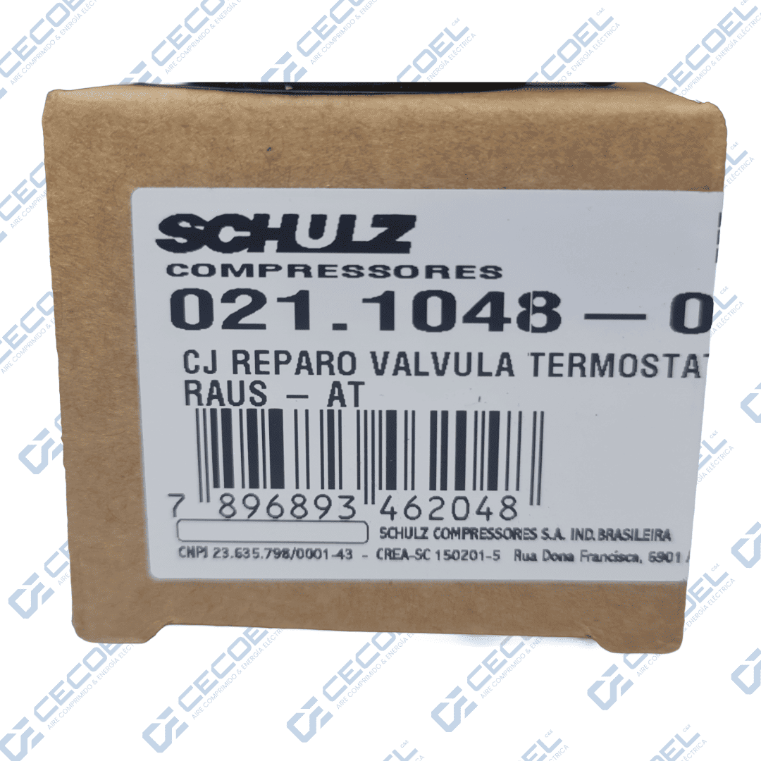 El kit de reparación de válvula termostática original Schulz (Código 021.1048-0/AT) es el repuesto vital para el control térmico de tu compresor de tornillo. Diseñado especialmente para la línea SRP, este elemento mecánico se expande a la temperatura exacta para desviar el aceite hacia el radiador. Evita paradas por sobrecalentamiento, previene la formación de barniz en la unidad compresora y alarga la vida útil de tu lubricante sintético.