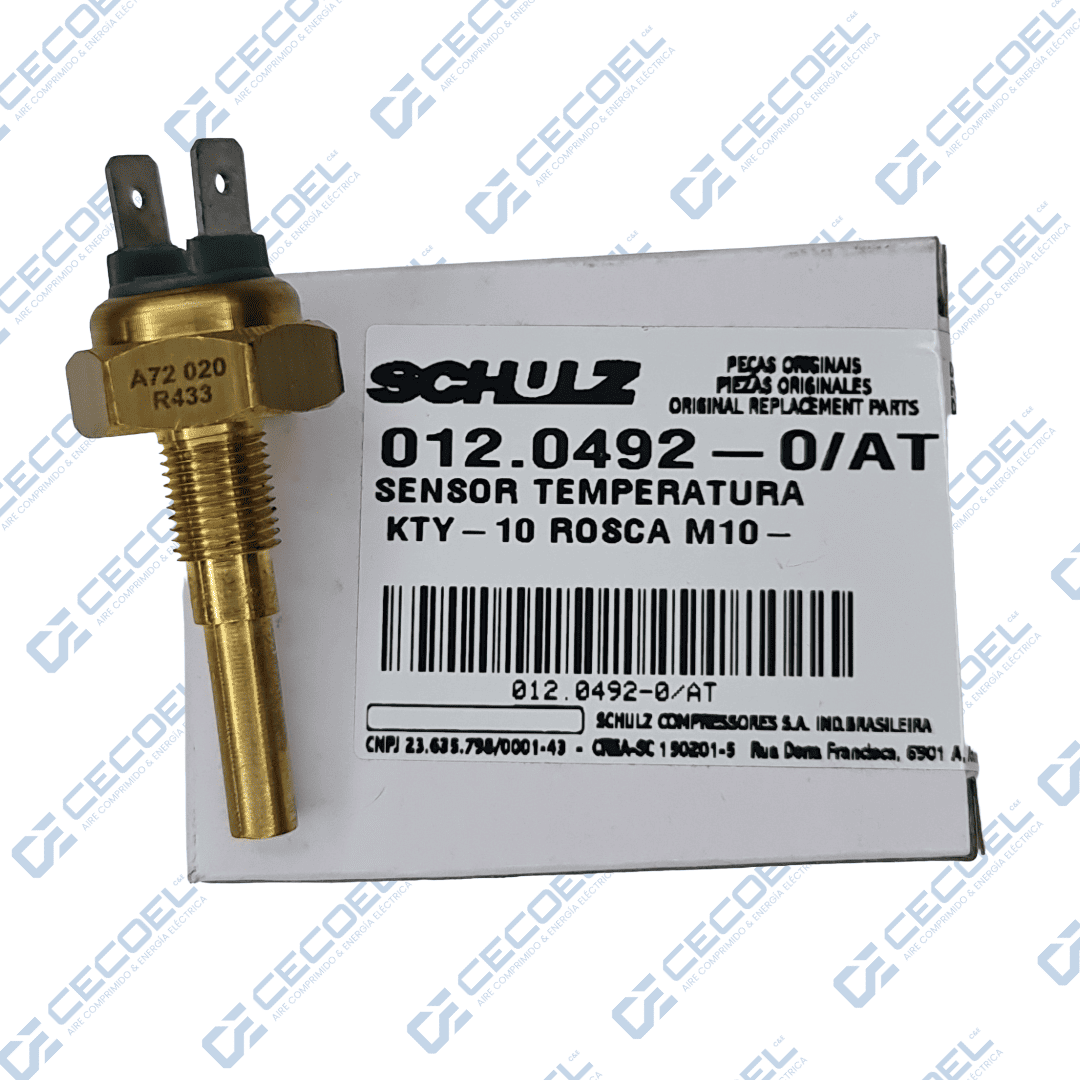 El sensor de temperatura Schulz 012.0492-0/AT es el componente electrónico de monitoreo más crítico de tu compresor de tornillo. En primer lugar, este repuesto original se instala estratégicamente en el bloque compresor (unidad de aire) para medir en tiempo real el calor generado por la fricción y la compresión.